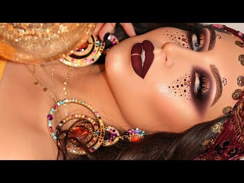For this look, the artist has created bold purple eye makeup with gold and purple lip color. The look is complete with sequin stars and a mystical moon. This is a mystical and amazing makeup idea. You can hand-paint the moon and sequin stars can be bought online. She has dark smokey eyes with glitter and purple lip color. The makeup is finished off with rhinestones, a symbol on her nose and a moon on her head.